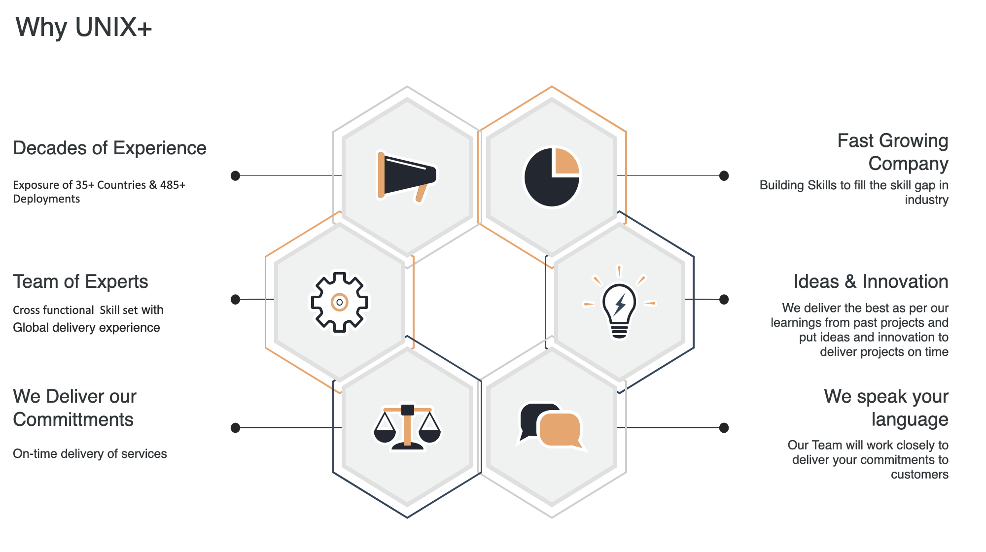 At Unix+, we believe in creating business value through innovation, expertise, and collaboration. Our vision is to apply a structured, thorough, and practical approach to deliver impactful solutions. With a team of dedicated technocrats, we embrace technology with positivity and focus on generating mutual benefits for our clients and partners.